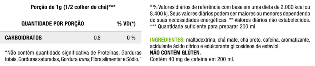 N-R-G PÓ: *Pó para o Preparo de Composto Líquido à base de chá preto e guaraná. Crianças, gestantes, nutrizes, idosos e portadores de enfermidades devem consultar o médico ou nutricionista antes de consumir este produto. Não é recomendado o consumo com bebida alcoólica. NÃO CONTÉM GLÚTEN