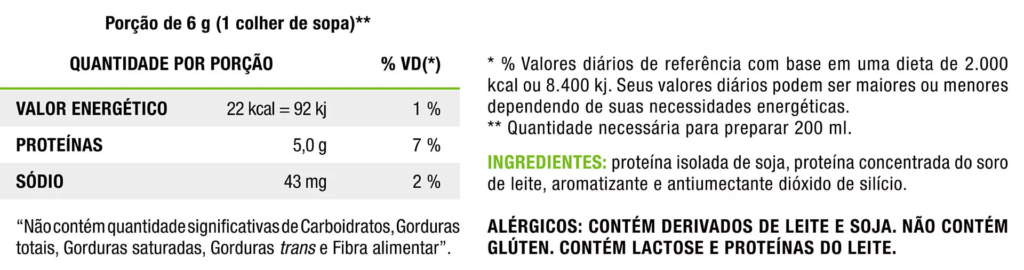 Combinação de proteína isolada de soja e concentrada do soro do leite, fornecendo 5g de proteína de alto valor biológico, por porção;